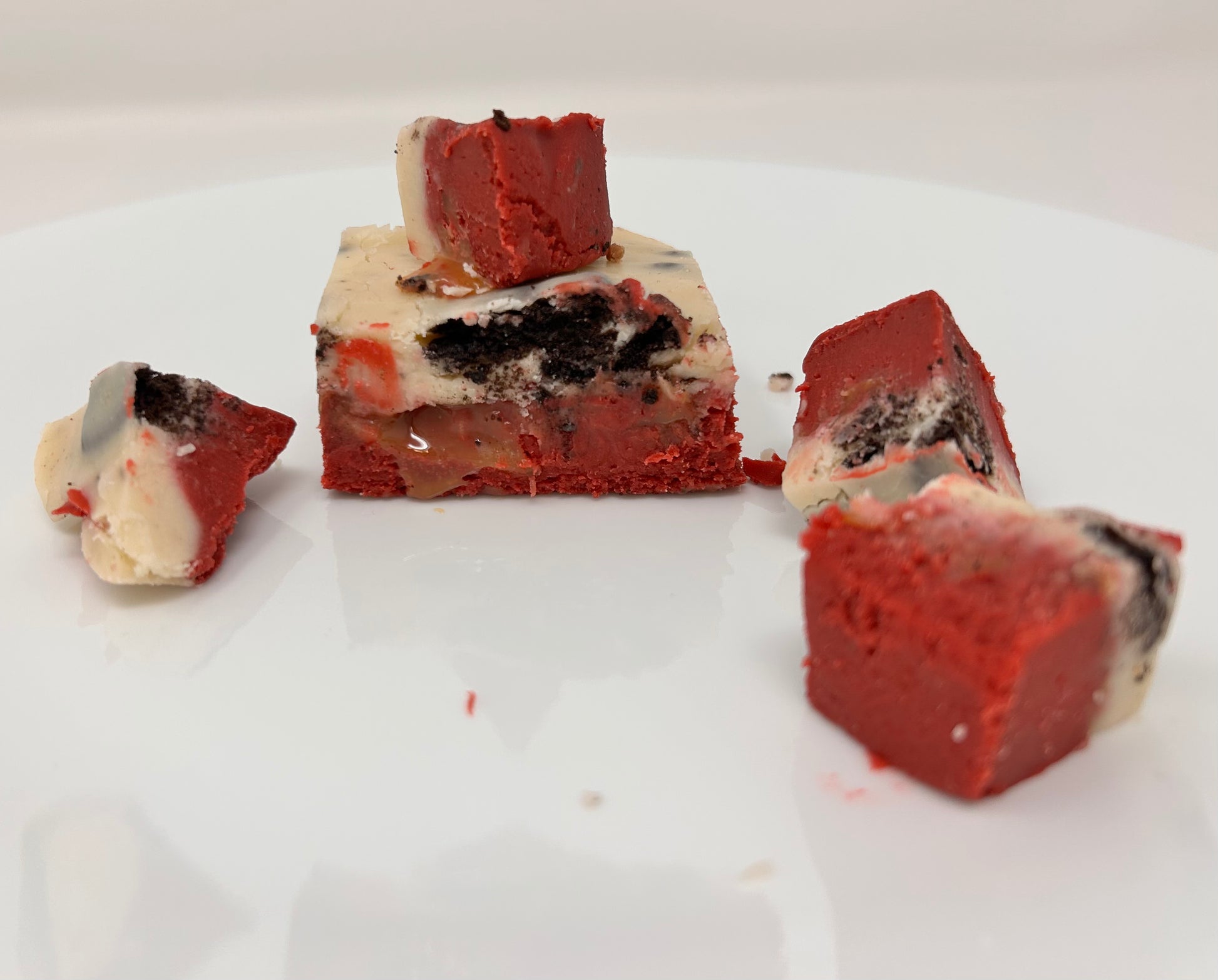 A layer of Red Velvet Fudge is topped with a layer of salted caramel, then we top that with a layer of cream cheese fudge mixed with Oreo cookies. Take one bite and agree with us that our friend has fantastic taste. Each container comes with approximately 1/2 pound of fudge and a knife for easy serving or defending.