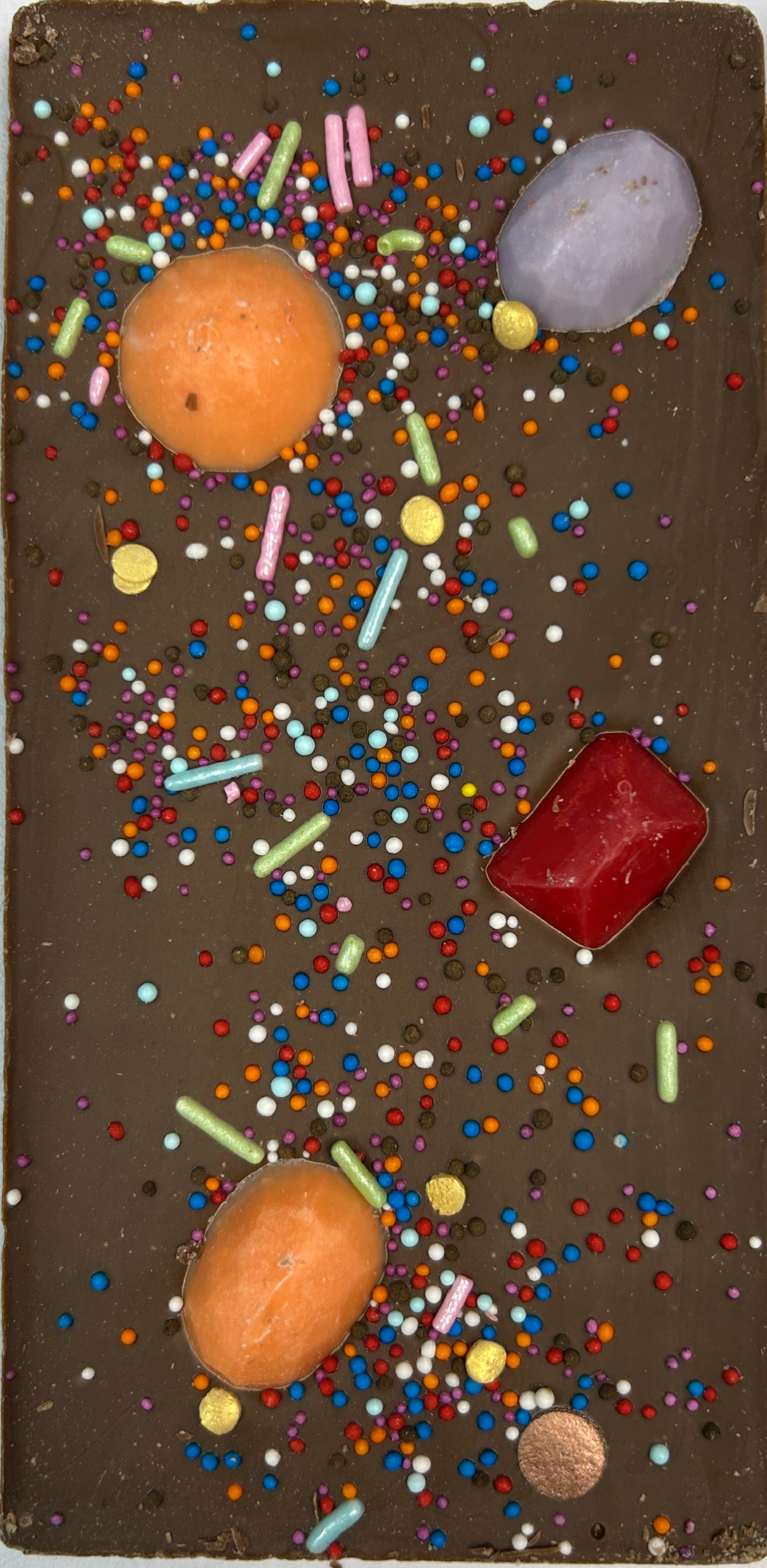 Inspired by the Eras tour this milk chocolate bar features multicolored white chocolate gems - celebrating the shining gem that our favorite pop start truly is. Sprinkles and nonpareils showcase pure joy and celebration!