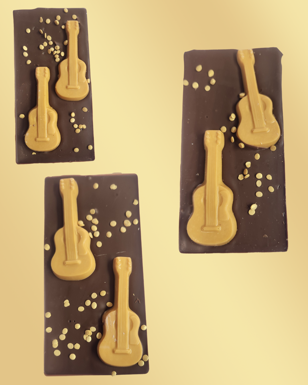 This is our most fearless bar. Milk chocolate with orange flavored guitars.