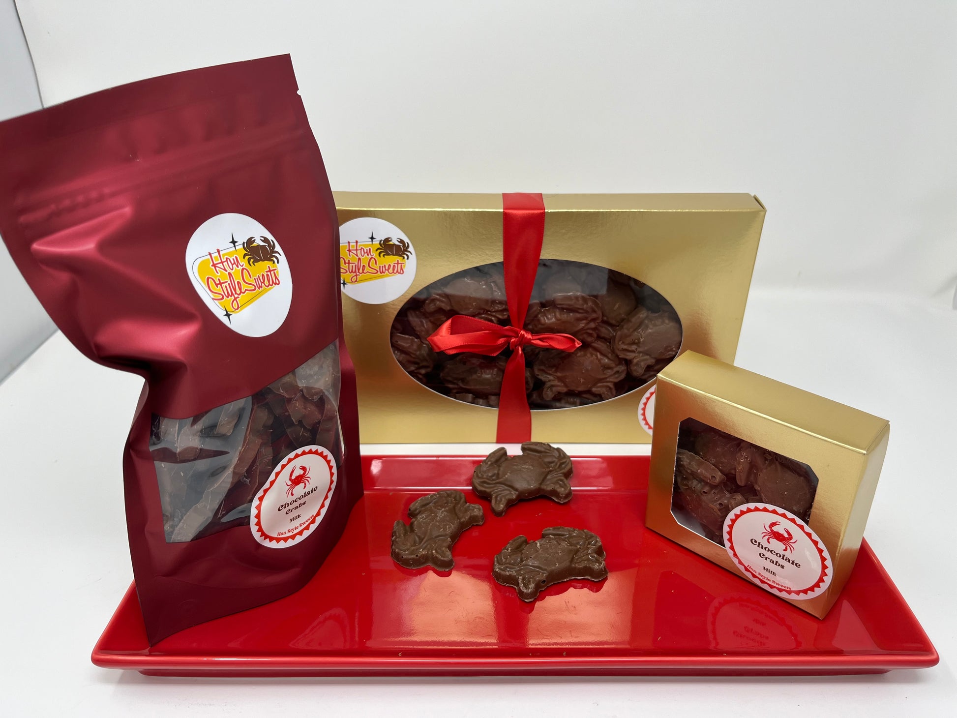 Solid milk chocolate in a cute crab shape. These ones do not contain Old Bay™.