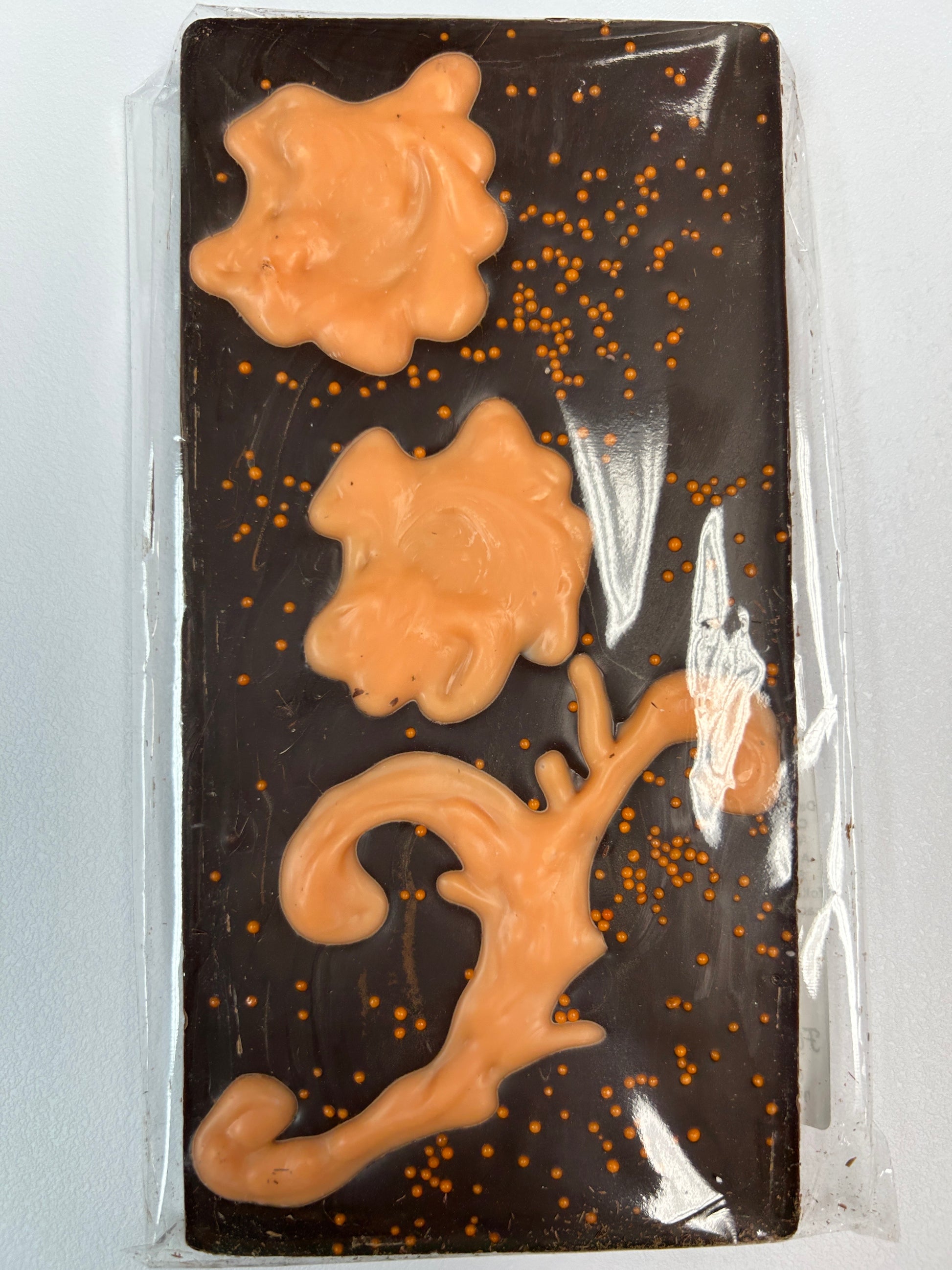 Decadent dark chocolate meets orange white chocolate swirls. It's our tribute to "The Life of a Showgirl"